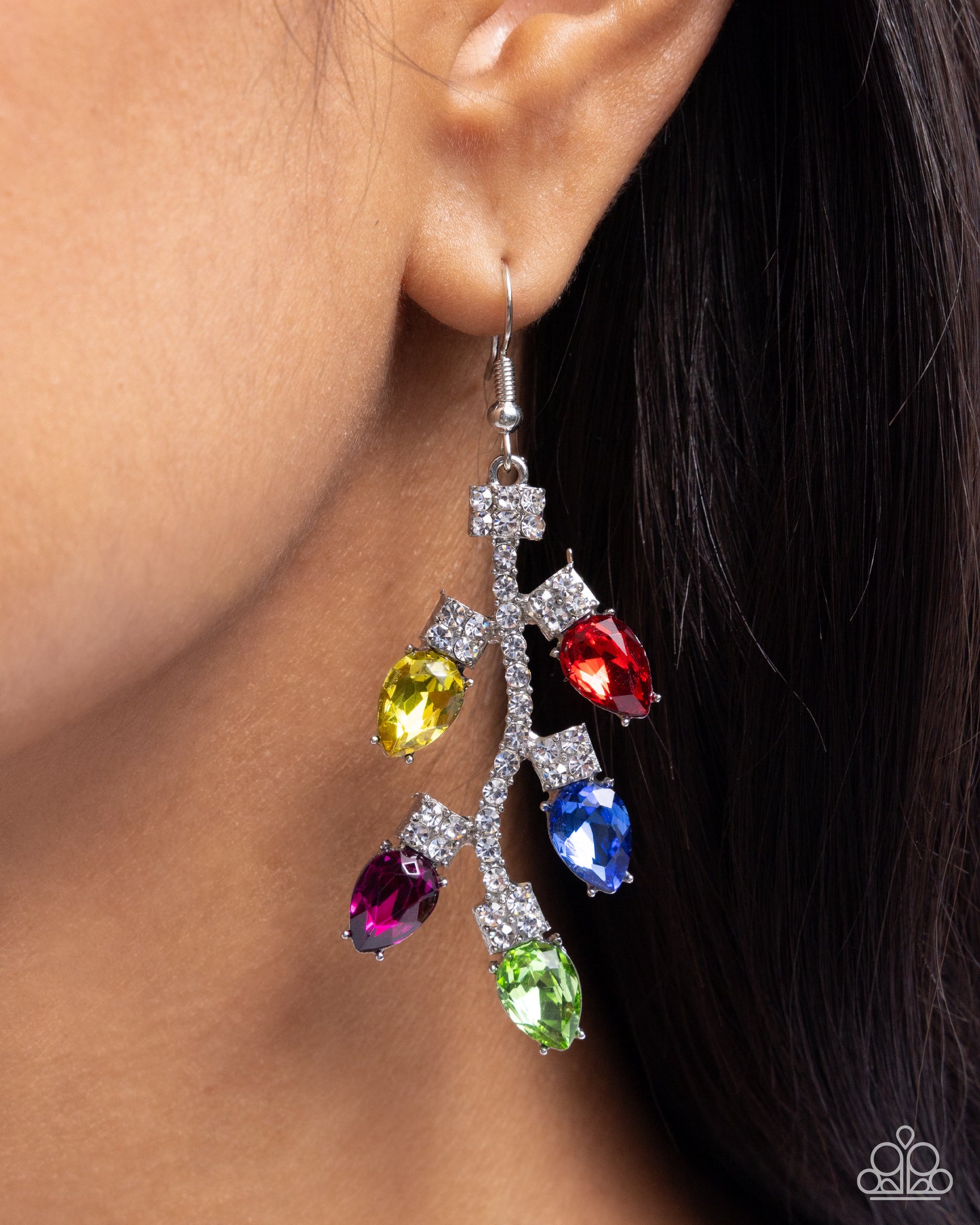 Reminiscent of Christmas lights, white rhinestones shimmer along silver squares that twinkle along a similarly rhinestone-embellished silver bar. Multicolored teardrop gems in pronged silver fittings give way from the silver squares creating the eye-catching bulbs for a festive flair. Earring attaches to a standard fishhook fitting.