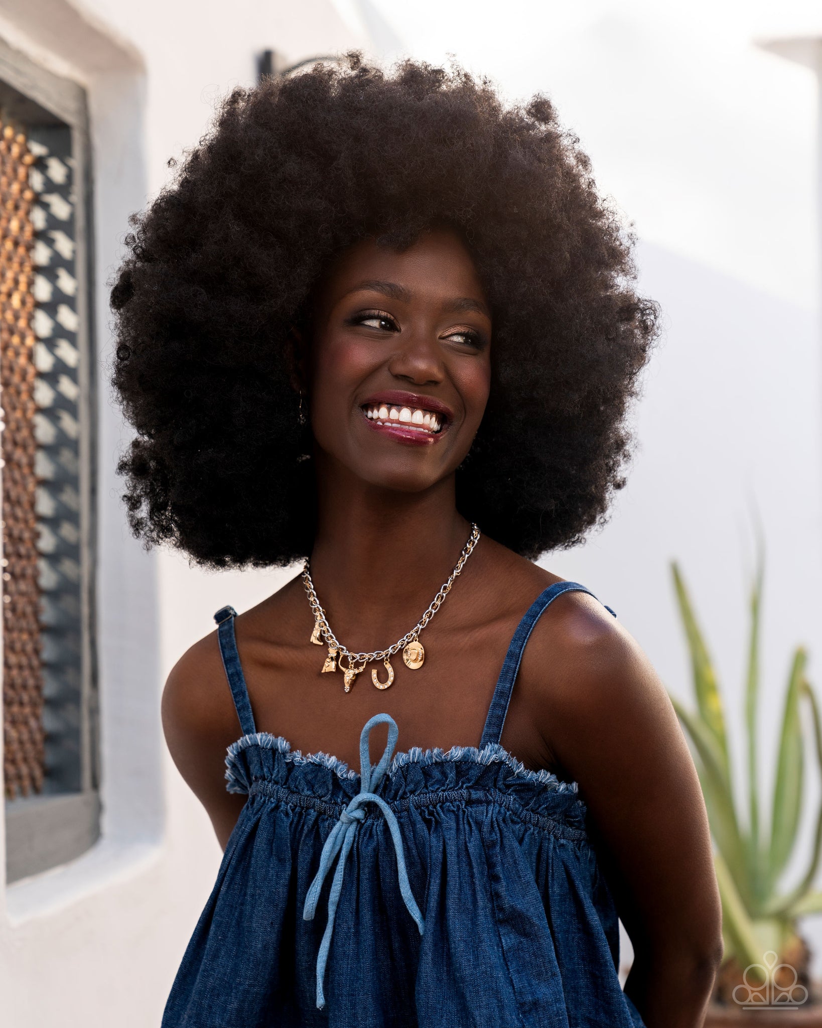 Threaded through oversized silver links, a dainty gold chain loops around the neckline for a dichromatic look. Featuring white rhinestone detailing, various gold western-inspired charms, including a cowboy boot, cowboy hat, horseshoe, longhorn skull, and a bag of money dangle for an eye-catching finish. Features an adjustable clasp closure.