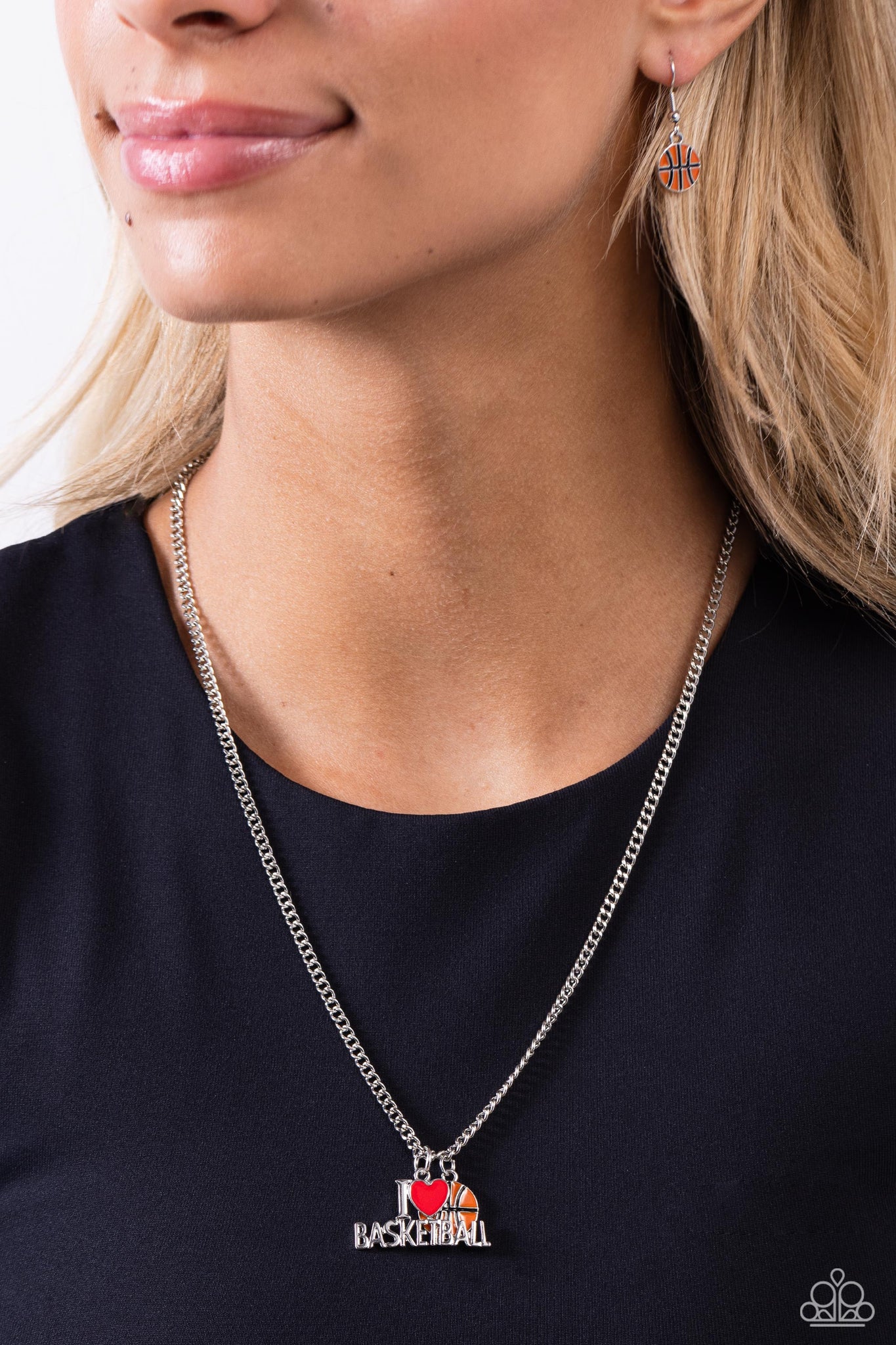 Dangling along a classic silver chain, a charm spelling out "I [Heart] Basketball" with a red-painted heart charm rests along the neckline. Infused along the chain, an orange basketball charm adds a sporty finish to the design. Features an adjustable clasp closure.