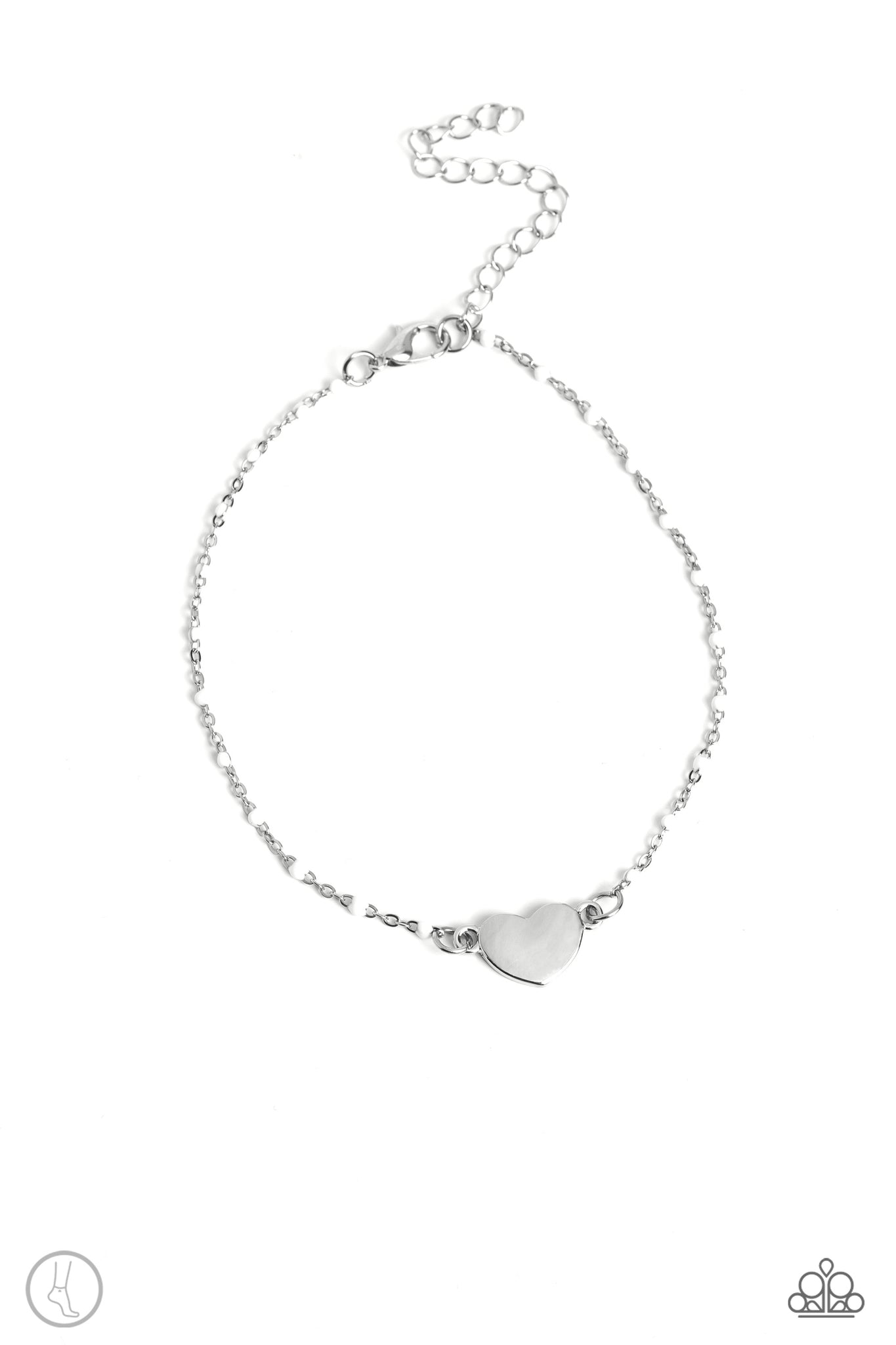 A dainty strand of white beaded silver chain wraps around the ankle for a dainty pop of color. An imperfect silver heart rests in the center of the beaded strand for a romantic finish. Features an adjustable clasp closure.
